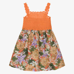 A pretty pink sundress for girls, handmade by Selini Action. Lovely and lightweight, this simple style is patterned with a beautiful tulip print in pink, orange and green. It has a gently elasticated, frilled bodice and a green ric rac trim around the hem.