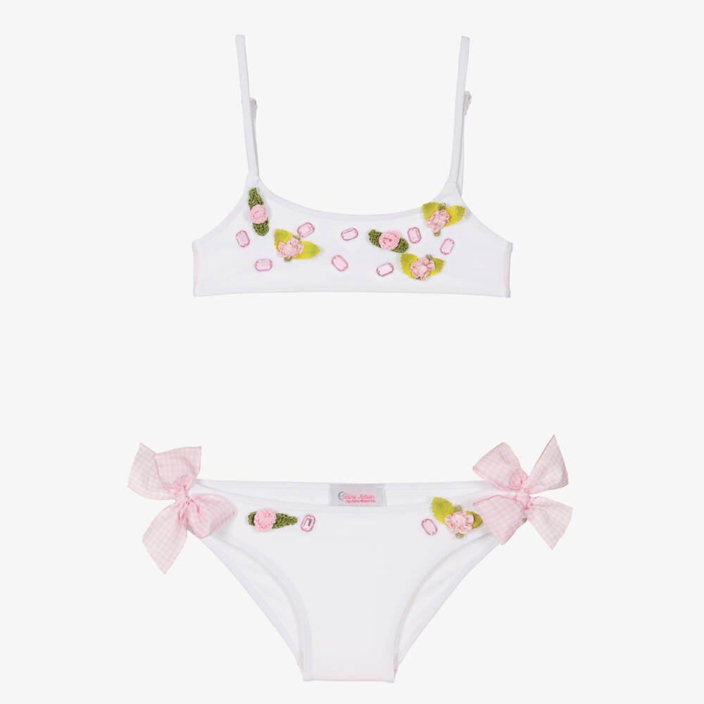A white bikini for girls from Selini Action, made in silky and stretchy fabric. Accented with pink and green, this handmade two-piece is decorated with sparkling faux gemstones and flower appliqués in crochet and satin. Lined on the front for comfort, the bikini top has adjustable shoulder straps and a resin clip closure on the back, whilst the bottoms have gingham bows on the sides and an elasticated waist for simple dressing.
