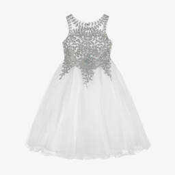 This gorgeous pink special occasion dress for girls by Sevva will make a statement at any event. Embellished with intricate gold embroidery and sparkling diamanté, the sheer bodice adds an elegant touch, while the corset-style back creates a flattering silhouette. Lined in lightweight satin, the full skirt is made with layers of soft tulle for a voluminous, eye-catching finish.