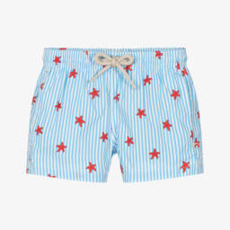 Boys blue and white swim shorts by Shade Critters, made in soft fabric with UPF 50+. These lightweight shorts are patterned with surfing dinosaurs on a contrasting striped background. Lined with comfortable mesh, they have an elasticated drawstring waist to adjust the fit. They have two side pockets and an additional velcro pocket on the back.