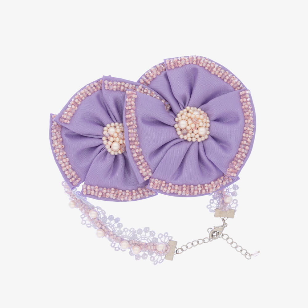 So pretty for girls, this purple necklace is from Sienna likes to party. It features two statement satin flowers set on a lace and beaded chain. Each flower has hand-stitched soft ivory pearls and sparkly pink cut crystal beads around the edges. An ideal way to finish a special outfit, it has an adjustable chain with a clasp fastening.