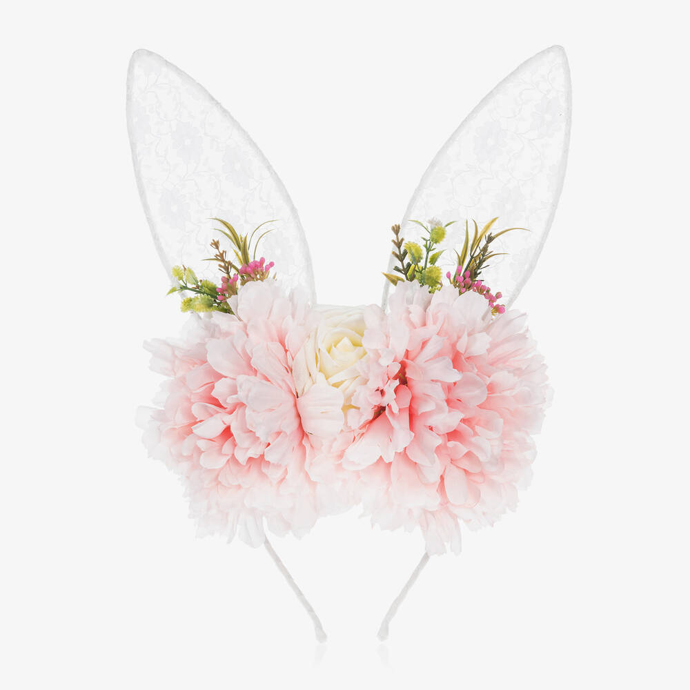 Girls white and pink special occasion lace bunny ears hairband from Sienna likes to party. The fabric carnations and roses are handmade and decorated with green floral sprigs. The metal band is wrapped in soft ivory velvet with lovely lace rabbit ears on the top.