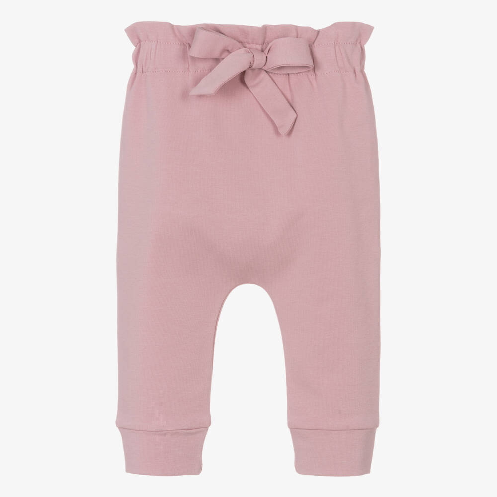 Sweet pink cotton trousers for baby girls by classic Polish brand Sofiya, made in comfortable jersey. They have a stretchy, elasticated and frilled waistband with a pretty bow in the centre and neat, cosy cuffs.