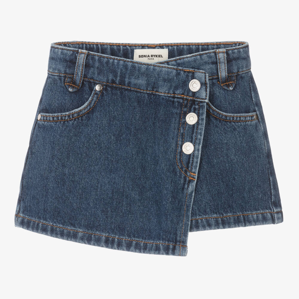 A cool cotton denim skort for girls by Sonia Rykiel Paris, with a useful adjustable waist. The front flap design that fastens with poppers conceals the zip and button fastening underneath. It has handy front pockets and back patch pockets embroidered with pretty stripes and stitched with a small logo charm.