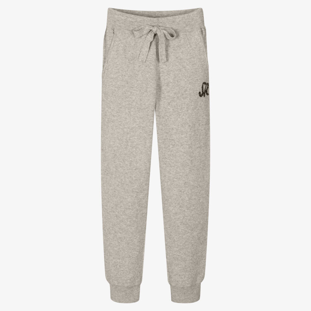 Comfortable grey marl joggers for teen girls by Sonia Rykiel Paris, with black and silver knitted logo letters on the front. Knitted in a soft cotton and wool blend, they have slanted front pockets and a faux drawstring on the elasticated waist.