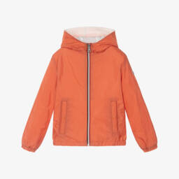 Dark orange hooded jacket for baby boys and girls by Sophie la Girafe, made with soft cotton corduroy. The front is embroidered with a white logo and it fastens with wooden buttons. There are front patch pockets and it is lined in super soft plush.