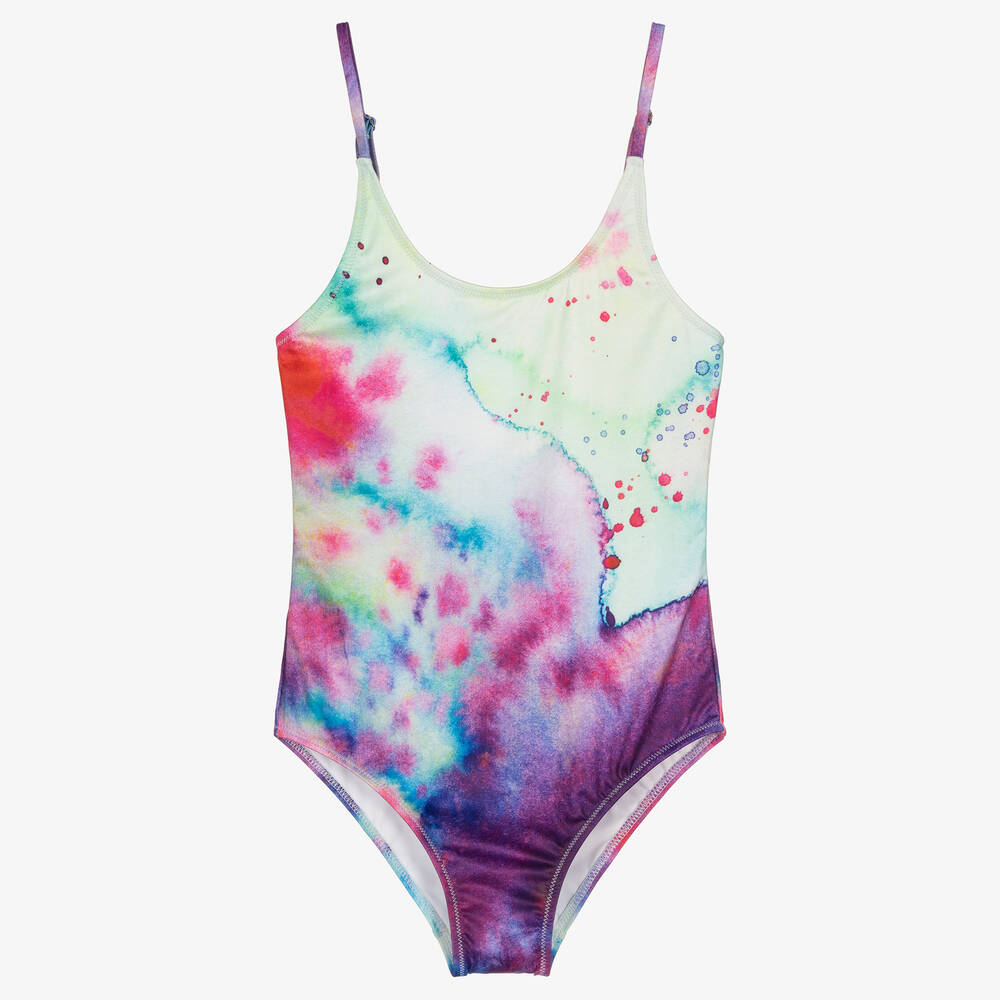 Patterned in a gorgeous watercolour tie dye print in purple, blue and pink, this contemporary swimsuit for teen girls is by American brand Stella Cove. Fully lined for comfort, this smooth and stretchy one-piece has adjustable shoulder straps for the best fit, with a scooped back for added elegance.