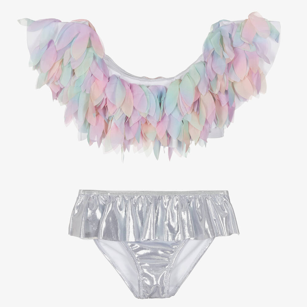 Super striking, this silver and white bikini for teen girls is by Stella Cove. Pretty and glamorous, the top has a lovely ruffle neckline that can be worn off-the-shoulder for a different look. It is decorated with a pastel rainbow petal-shaped trim for a fun finish. Made from soft and stretchy fabric, the eye-catching metallic bottoms have a comfortable elasticated waistband with frilled detailing.
