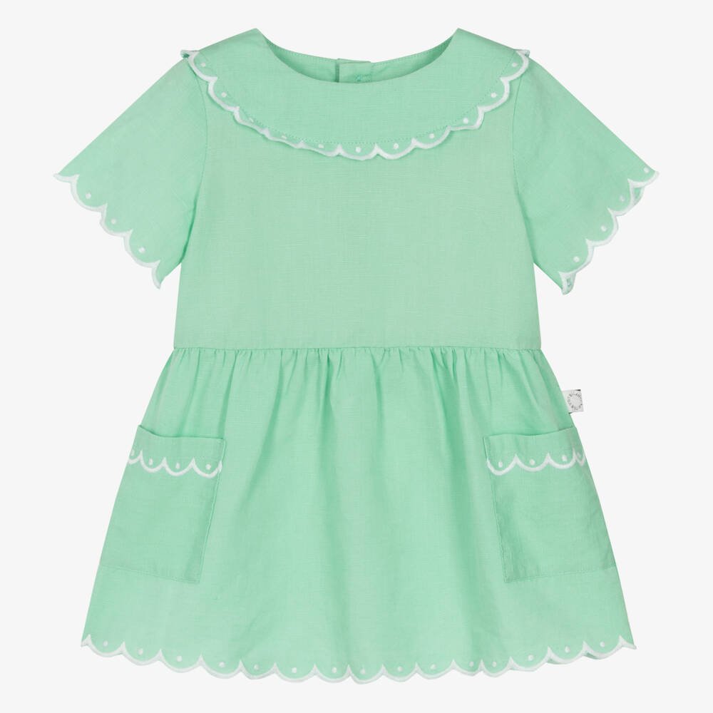 Lovely green dress for baby girls by Stella McCartney Kids, made in a soft and lightweight linen and cotton blend. Ideal for warmer days, it has short sleeves and pretty scalloped edges trimmed in white. There are patch pockets on the front and branded button fastenings on the back for a subtle designer finish. The Stella McCartney fit can be quite small so choose a size up if you want room to grow.