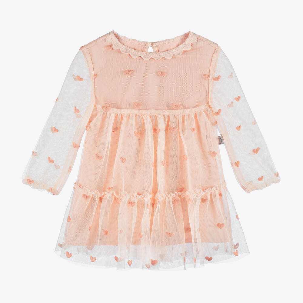 An adorable pink dress for baby girls by Stella McCartney Kids, made in layers of delicate tulle and patterned with embroidered hearts. With semi-sheer long sleeves, this sweet dress has a frilled hem and a pretty scalloped trim around the neckline. It has a soft and lightweight viscose lining for comfort against delicate skin and fastens with a single button on the back. The Stella McCartney fit can be quite small so choose a size up if you want room to grow.