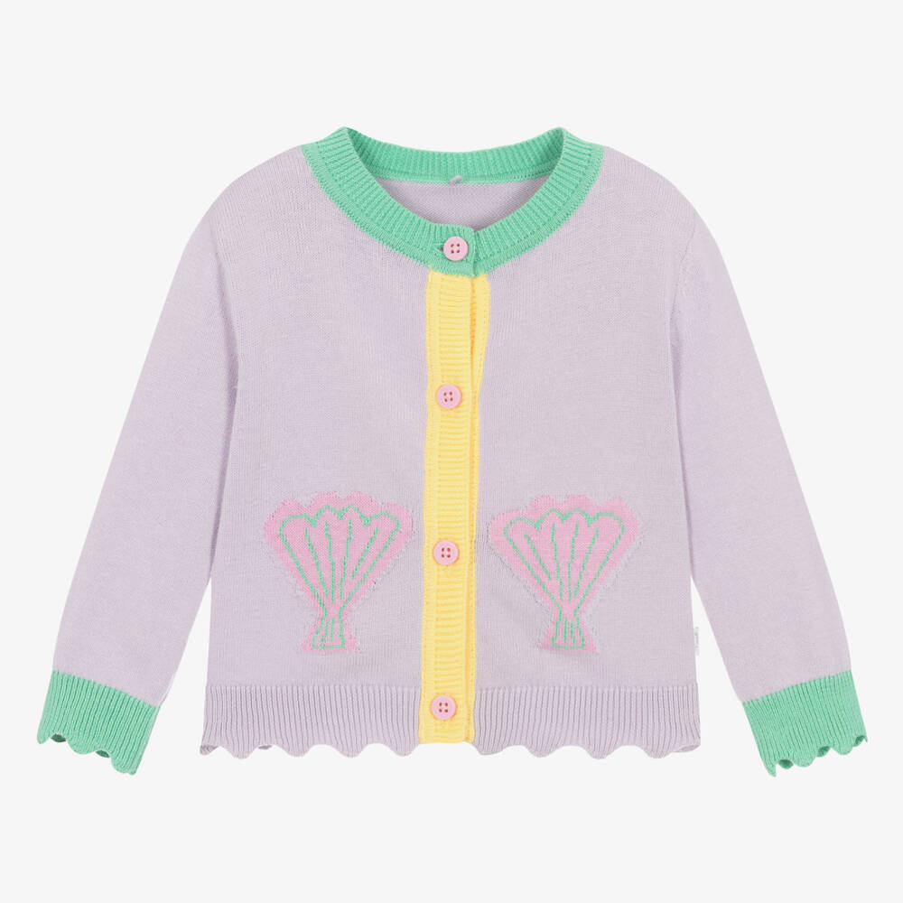 Pretty lilac purple cardigan for baby girls by Stella McCartney Kids, knitted in soft organic cotton. This lovely, long-sleeved design has colourful green and yellow trims and sweet scalloped edging on the hem and cuffs. It has pink and green intarsia seashells on the front and fastens with pink branded buttons. The Stella McCartney fit can be quite small so choose a size up if you want room to grow.