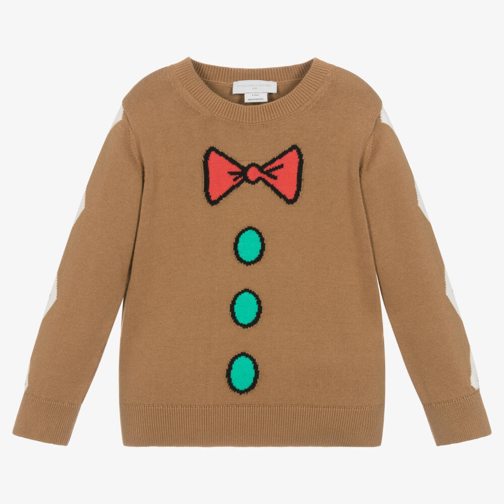 A dark beige sweater for boys and girls by Stella McCartney Kids, finely knitted in soft organic cotton. Fun and festive, it is designed to look like delicious gingerbread with a red bow tie, green spots and white zigzags on the sleeves. The Stella McCartney fit can be quite small so choose a size up if you want room to grow.