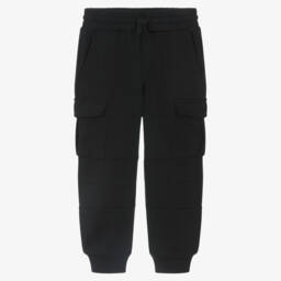 Black organic cotton joggers for boys by Stella McCartney Kids, with cool cat motifs in yellow and blue. Made in soft, comfortable jersey, they have an elasticated waist and useful side seam pockets.