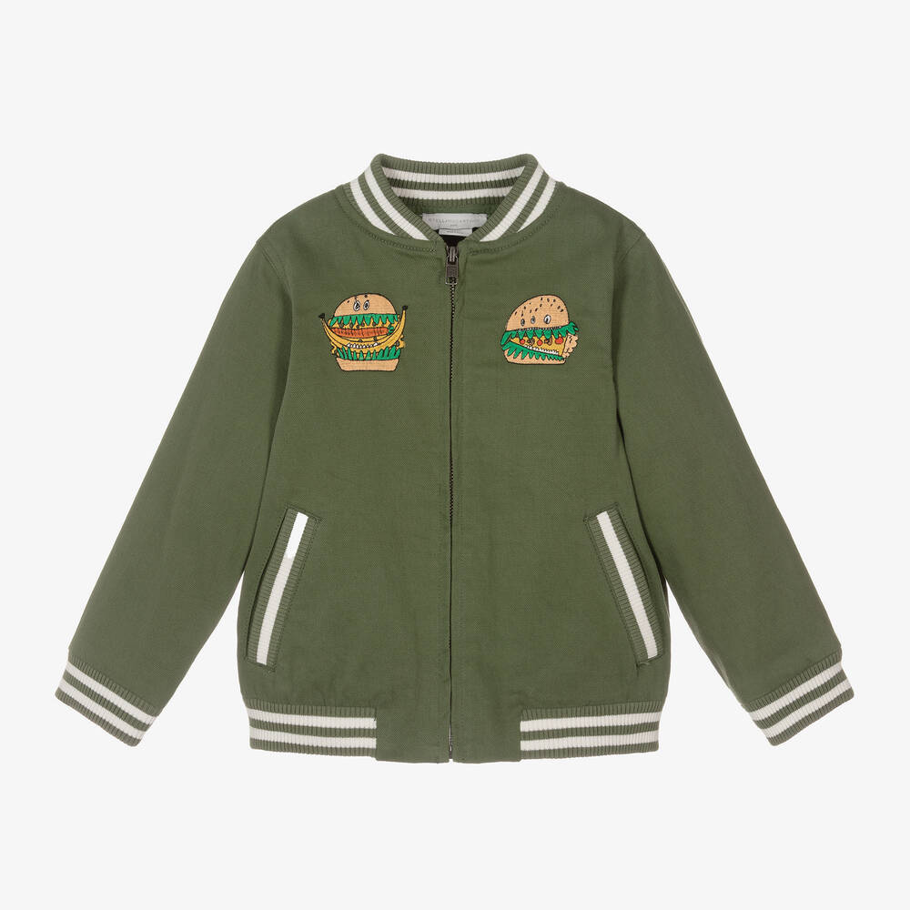 A khaki green bomber jacket for boys by British brand Stella McCartney Kids, made from soft cotton twill. It has burgers embroidered on the front and a 'Hangry Monster on the Loose' slogan on the back for a playful streetwear statement. The collar, pockets and cuffs are trimmed in a stretchy ribbed fabric and a zip fastens easily on the front. The Stella McCartney fit can be quite small so choose a size up if you want room to grow.