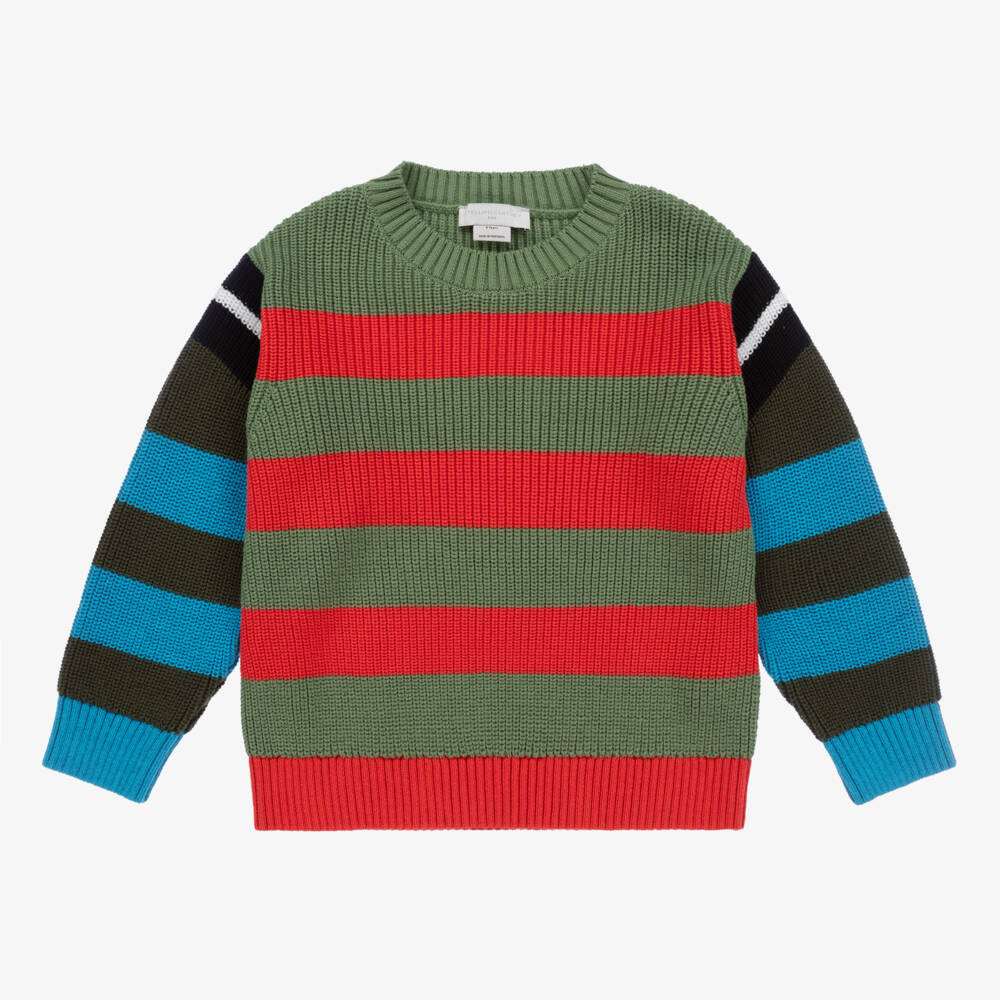 Fun and colourful, relaxed-fitting sweater for boys by Stella McCartney Kids, in khaki green, red and blue stripes. Chunky and ribbed, it is knitted in an organic cotton and wool blend for cosiness, with dropped shoulders for a laid-back look. The Stella McCartney fit can be quite small so choose a size up if you want room to grow.