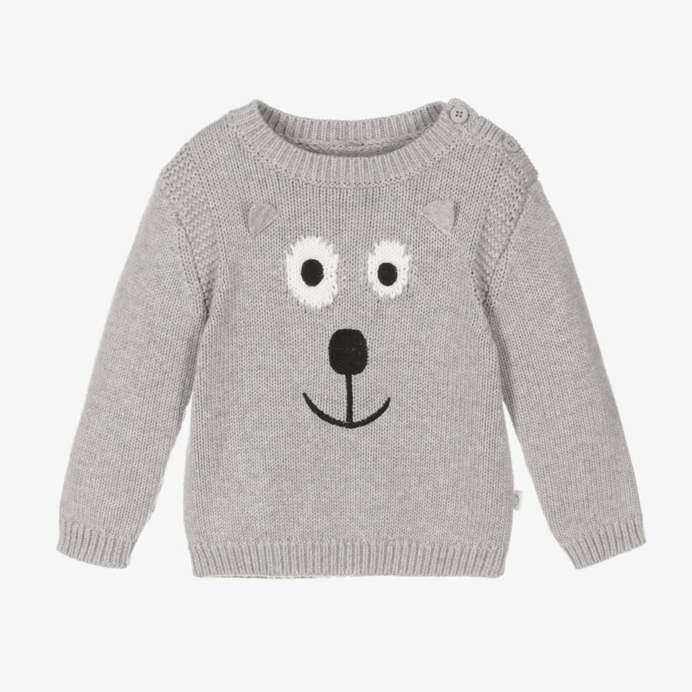 Irresistibly cute for little boys, this grey bear jumper is from Stella McCartney Kids. Knitted in beautifully soft organic cotton, it is patterned with a smiling bear face and has little 3D ears. This crew neck style has gentle ribbed trims and button fastenings on one shoulder to help with dressing. For a discreet designer touch, there is a branded tab on the side seam. The Stella McCartney fit can be quite small so choose a size up if you want room to grow.