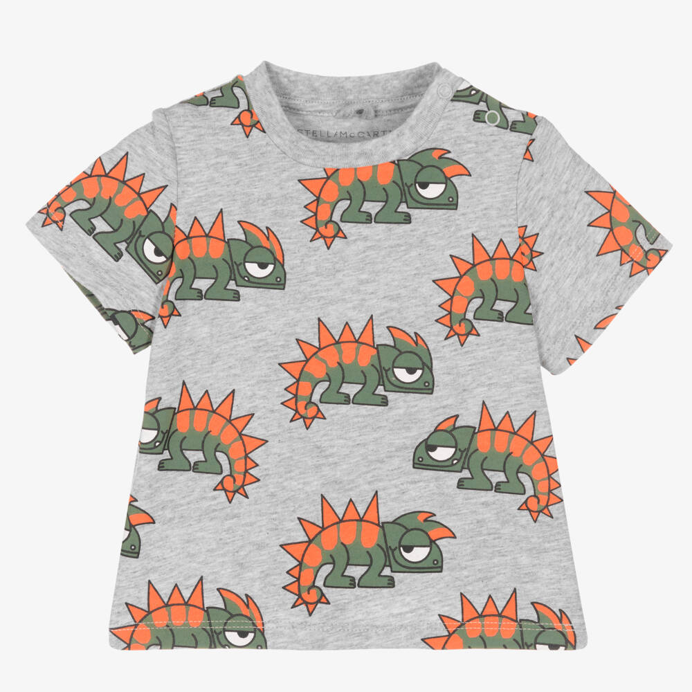 Adorable grey marl T-shirt for little boys by Stella McCartney Kids, patterned with green and neon orange gecko prints. Cute and comfortable, it is made with sustainable organic cotton jersey with poppers on the shoulder to assist when dressing.