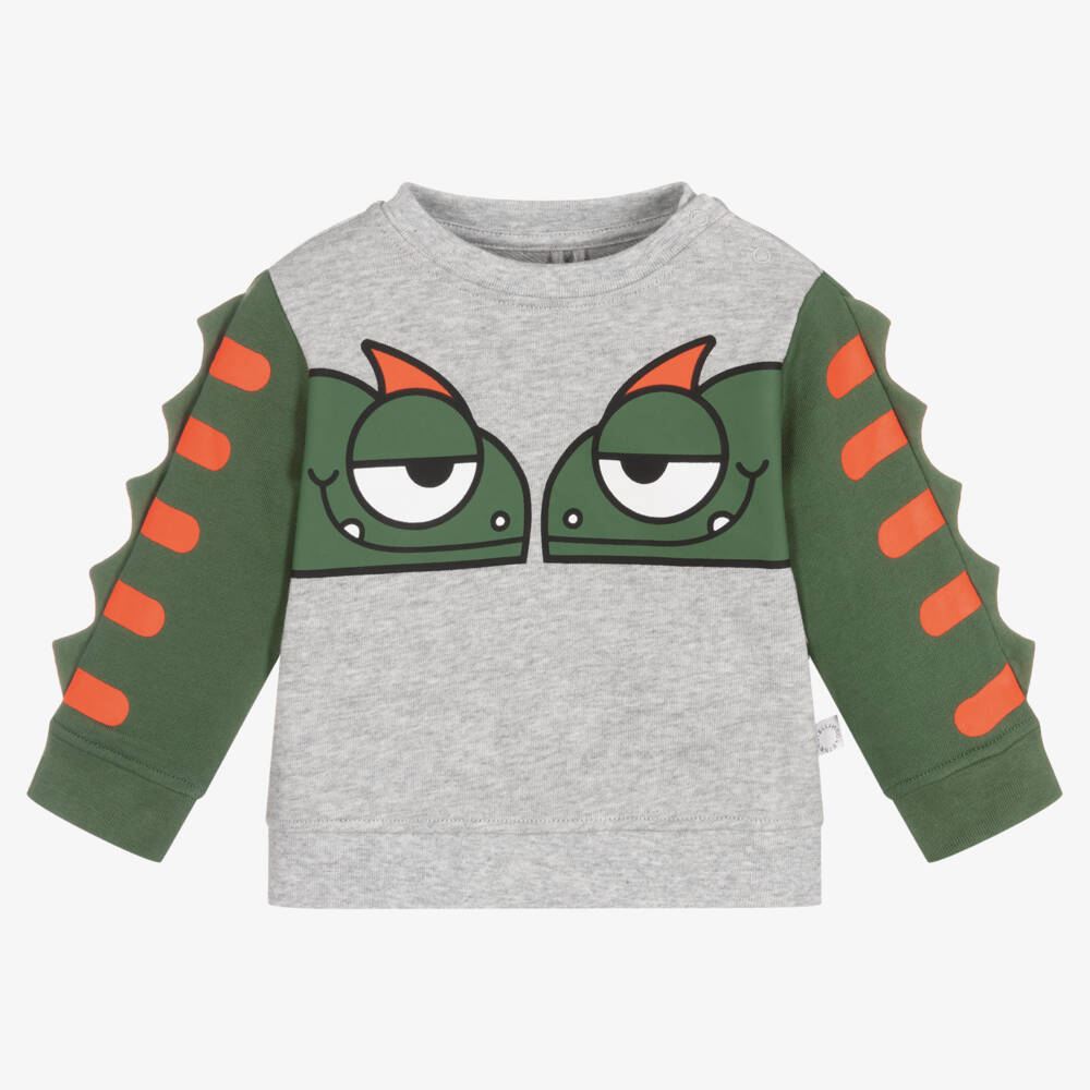 Casual grey marl sweatshirt for little boys, by Stella McCartney Kids. Made in soft organic cotton jersey, it has two geckos printed on the front and contrasting green sleeves with cool 3D spikes. It fastens easily with poppers on one shoulder. The Stella McCartney fit can be quite small so choose a size up if you want room to grow.