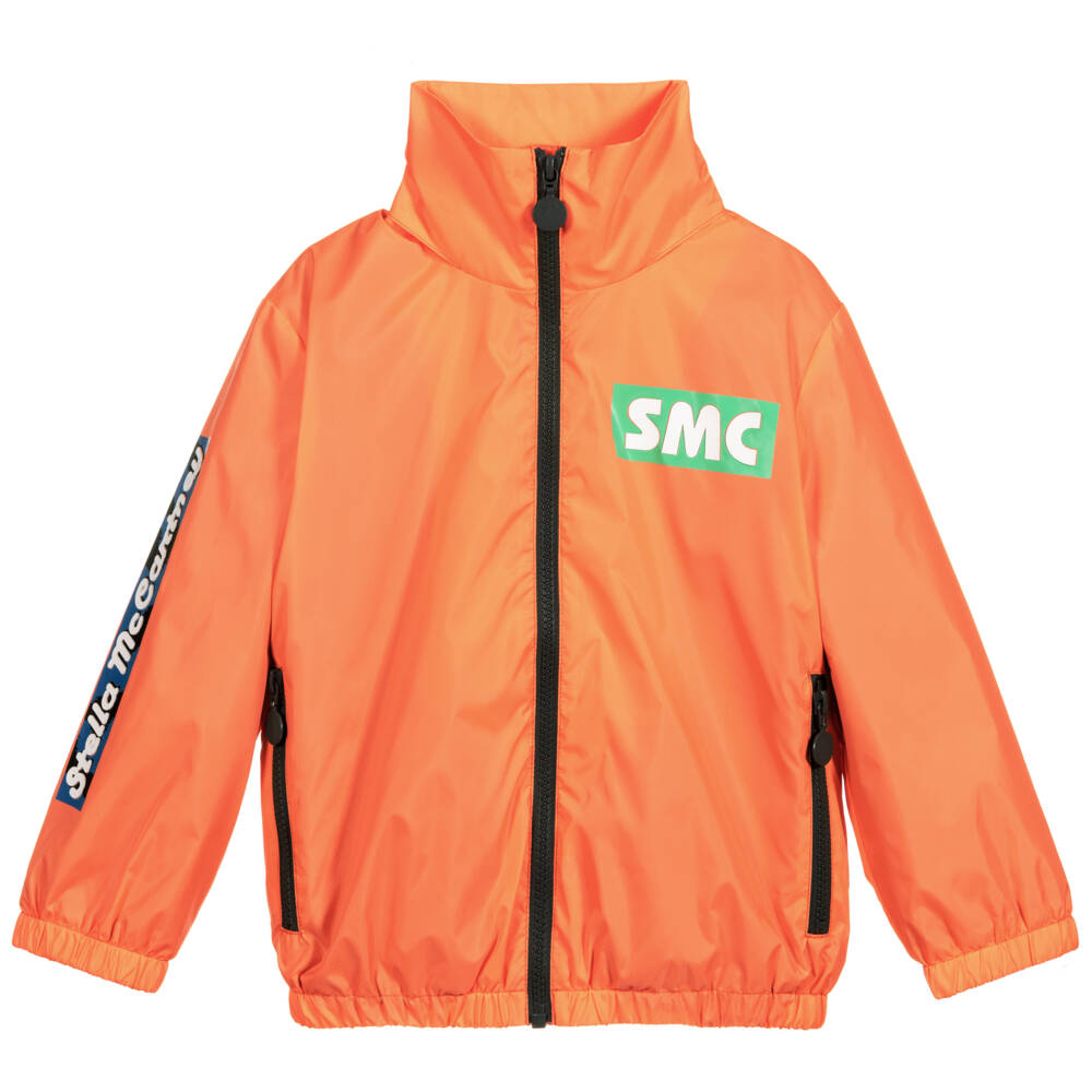 Bright orange jacket by British designer Stella McCartney Kids, with green and blue logo branding on the chest and one sleeve. Made in lightweight, recycled polyester, it has exposed grey zip fastenings on the front and pockets, with a grey mesh lining for comfort. The hood is packed away in the deep collar.