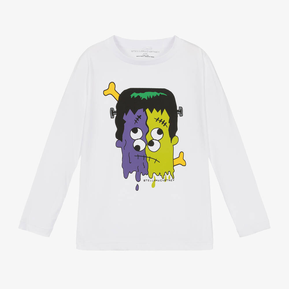 White long-sleeved top for boys by Stella McCartney Kids, made in soft organic cotton jersey. Part of the Halloween collection, this comfortable, casual top has a fun Frankenstein design printed on the front. The Stella McCartney fit can be quite small so choose a size up if you want room to grow.