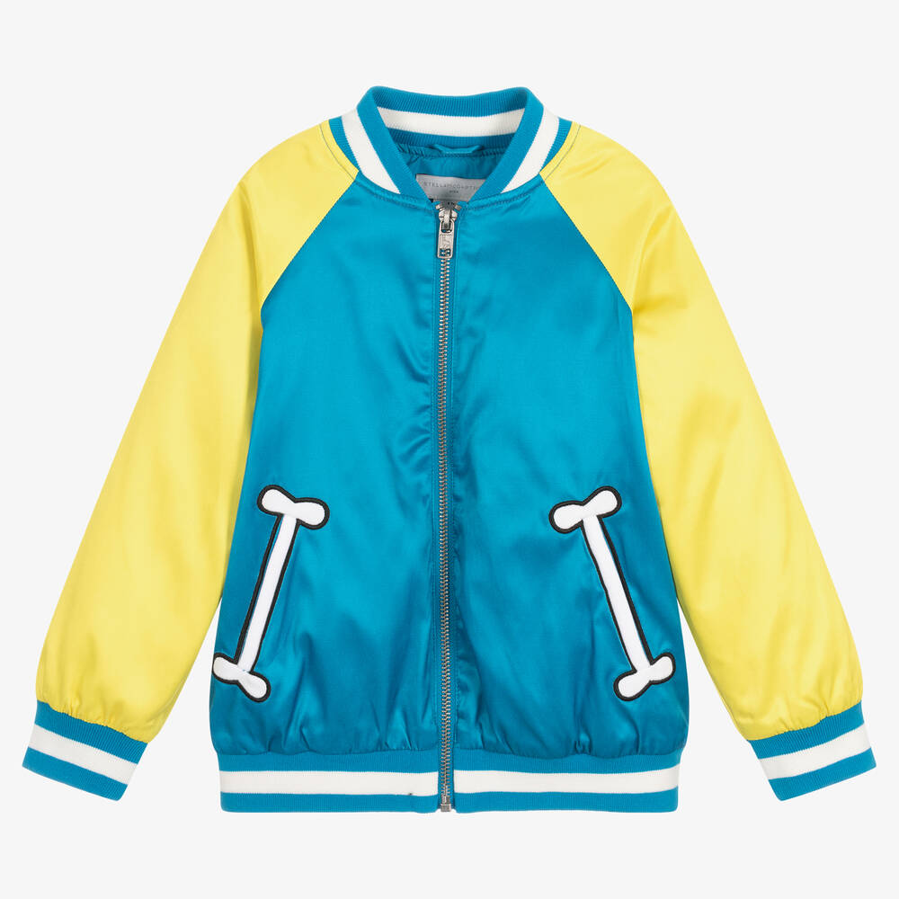 Stylish blue and yellow bomber jacket for boys, by Stella McCartney Kids. Made in luxuriously soft satin, the ribbed trims have sporty stripes and there are cool embroidered pockets in the shape of bones. Fastening with a smooth zip on the front, it has fun yellow raglan sleeves. The back of this layering piece steals the show, with a whimsical rollercoaster fairground embroidery. The Stella McCartney fit can be quite small so choose a size up if you want room to grow.