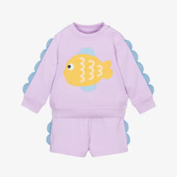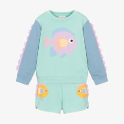 Girls blue cotton short set by Stella McCartney Kids, with a playful fairies print in fun pastel shades. Made in organic cotton jersey for a more sustainable choice, this comfortable little set has a drawstring waistband for a great fit.