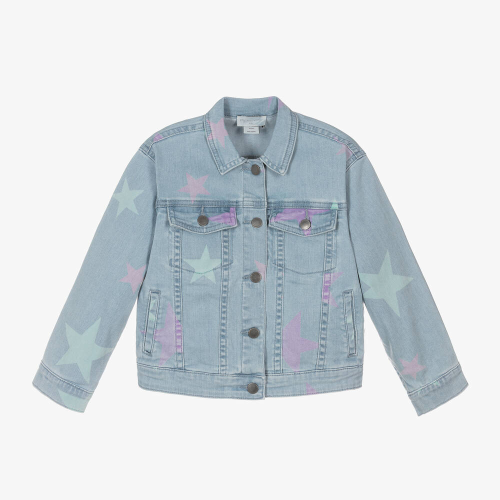 A blue denim jacket for girls by British brand Stella McCartney Kids, made from soft and stretchy organic cotton. Fun and playful, it has a faded star pattern in pastel colours of pink, purple and mint green. It is styled with a button-up front, pockets and adjustable button tabs on the hem. The Stella McCartney fit can be quite small so choose a size up if you want room to grow.