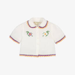A charming ivory dress for girls by Stella McCartney Kids, woven in a soft blend of cotton and linen. It features pretty floral embroidery and scalloped crochet trims in orange, purple and green. Lined in lightweight voile for comfort, this sleeveless style has a frilled hem and a keyhole button fastening on the back.