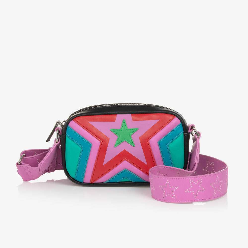A pink and black messenger bag for girls by Stella McCartney Kids, made from smooth faux leather. For a fun look, it has a colourful star design on the front in vibrant shades of red, pink, and green. The small but spacious main compartment has silky lining and a handy internal slip pocket. Fastening with a zip, it has a pink adjustable shoulder strap with a perforated star pattern for a cool finish.