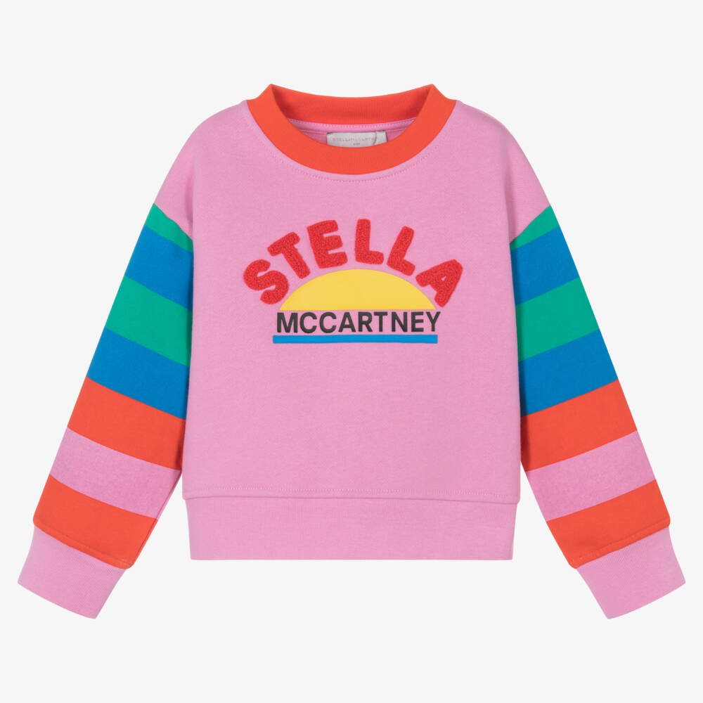 A pink sweatshirt for girls by Stella McCartney Kids, made from super soft cotton jersey. It has a towelling and printed logo design on the front, with colourful striped sleeves for a fun yet casual look. This crew neck top is finished in a boxy fit. The Stella McCartney fit can be quite small so choose a size up if you want room to grow.