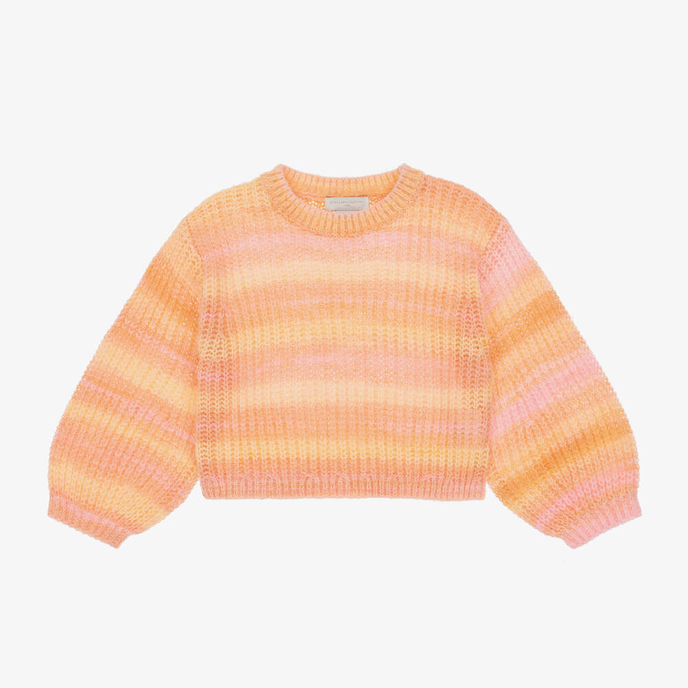 Pretty pink and yellow striped sweater for girls by British brand Stella McCartney Kids, in a cosy, chunky knit. Made in beautifully soft, recycled yarn, it has a relaxed fit with dropped shoulders on the long, balloon sleeves and neat, ribbed trims. The Stella McCartney fit can be quite small so choose a size up if you want room to grow.
