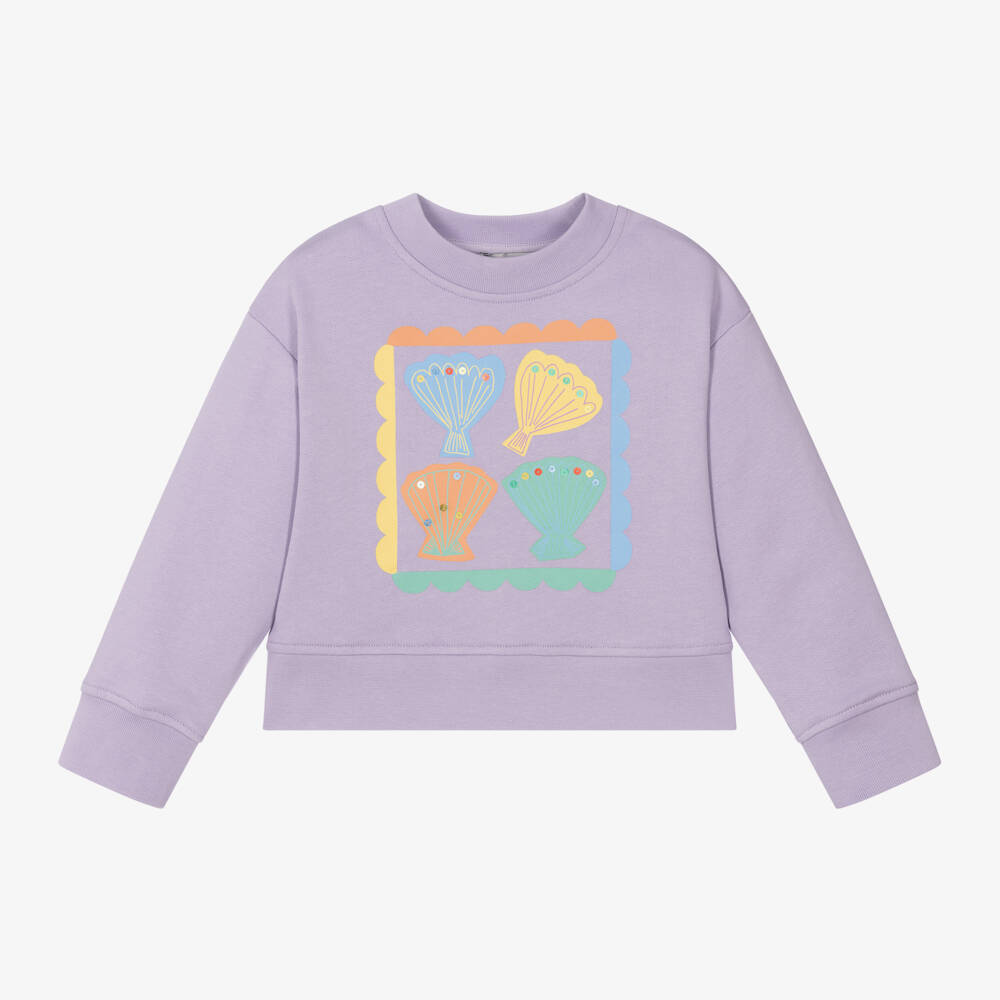 Lilac purple organic cotton sweatshirt for girls by British brand Stella McCartney Kids, with a sequin-embellished print of seashells on the front in pastel colours. Made in soft, comfortable jersey with neat, ribbed trims, this long-sleeved sweatshirt is ideal for relaxed days. The Stella McCartney fit can be quite small so choose a size up if you want room to grow.