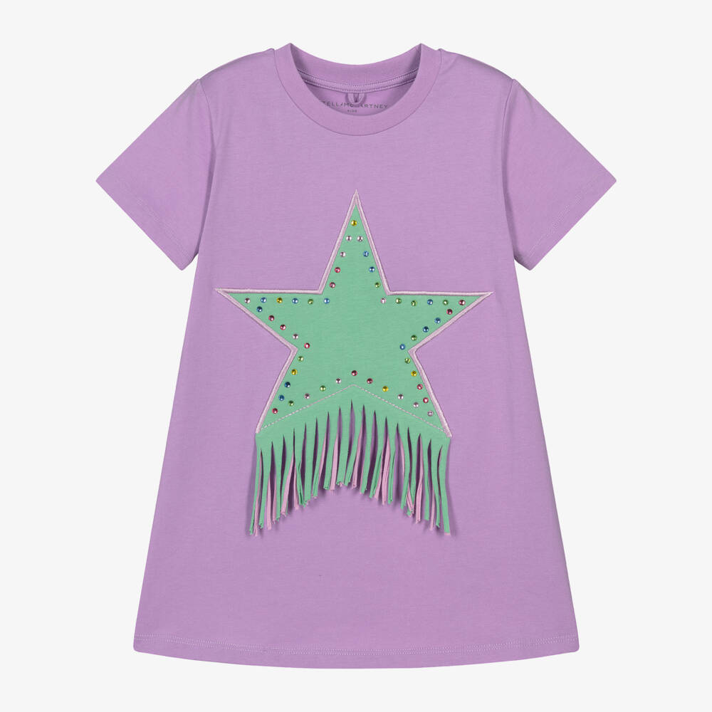 Casual purple T-shirt dress for girls, with designer style by Stella McCartney Kids. Made in soft and comfortable cotton jersey with a gentle A-line shape, it has a large green star appliqué on the front, trimmed with embroidery, colourful diamantés and layered fringing for added texture. The Stella McCartney fit can be quite small so choose a size up if you want room to grow.
