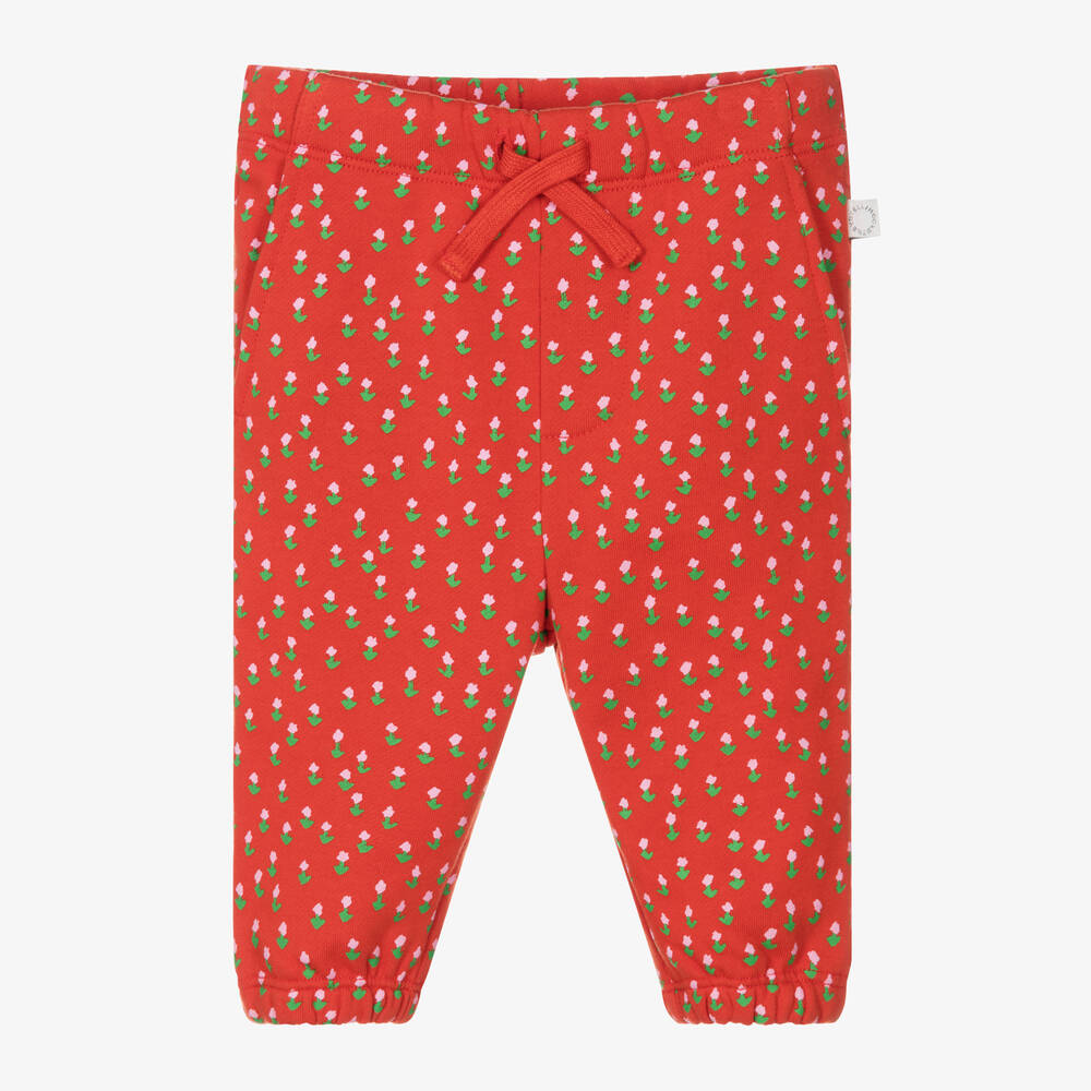 Lovely flame red joggers for little girls by Stella McCartney Kids, made from mid-weight organic cotton jersey with a fleecy feel inside. Printed with a pretty pink and green floral pattern, they have slanted pockets and a comfortable drawstring waist. The Stella McCartney fit can be quite small so choose a size up if you want room to grow.