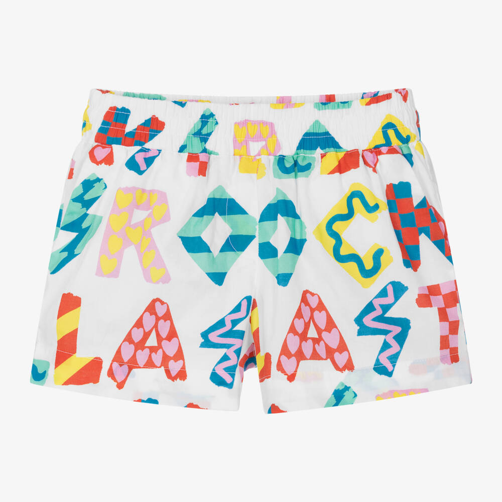 White shorts for girls by Stella McCartney Kids, made in soft organic cotton, with a lightweight voile lining for comfort. Patterned with graphic logo lettering all over for a fun, quirky look, they have slanted pockets on the front and patch pockets on the back. The Stella McCartney fit can be quite small so choose a size up if you want room to grow.