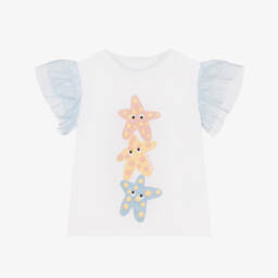 Футболка белая из хлопка с синим принтом звезд для девочек