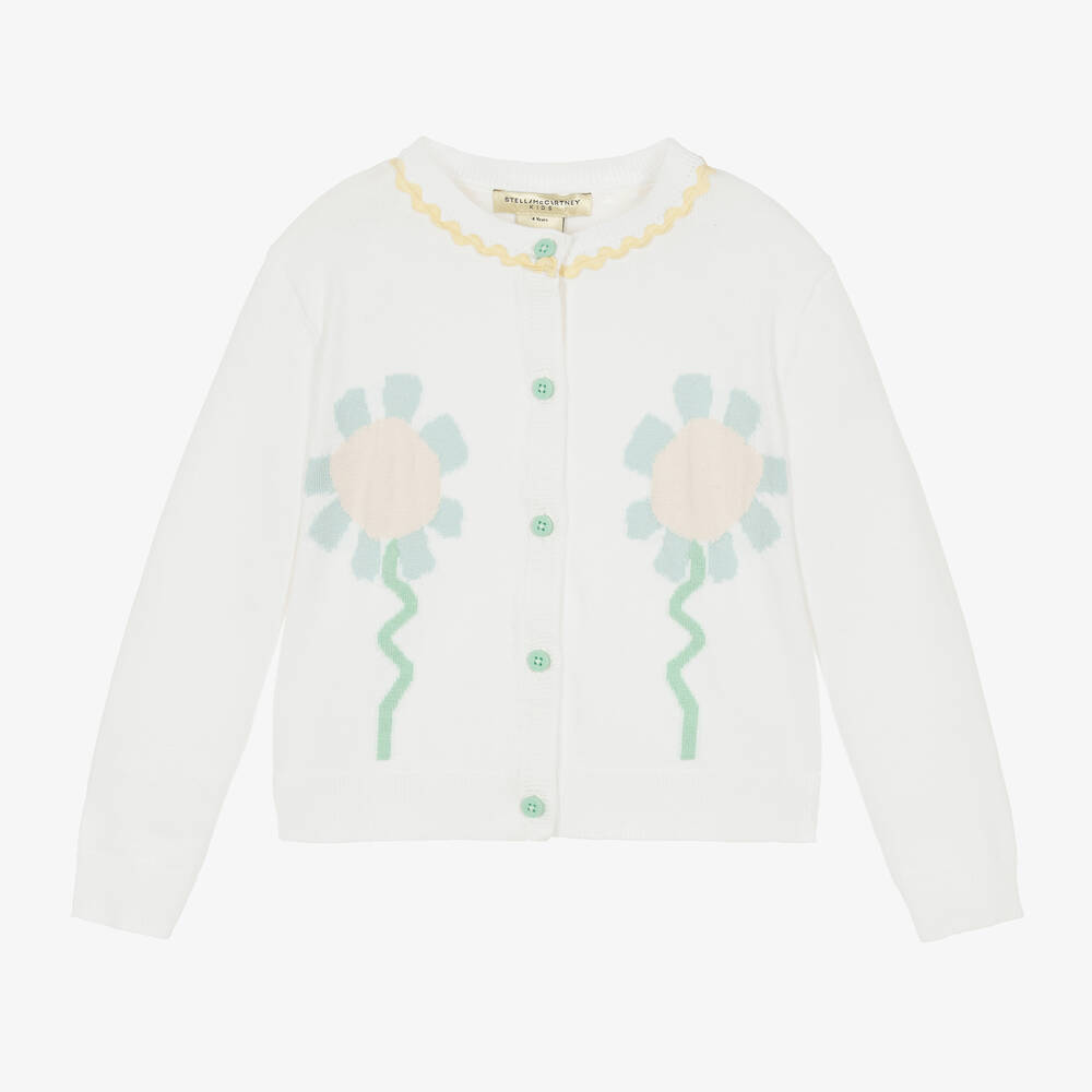 A lovely white cardigan for girls by Stella McCartney Kids, made in a fine and soft organic cotton knit. The front has knitted flower motifs in pale pink, blue and green, with branded green button fastenings. There is a yellow ric rac trim around the ribbed neckline for a pretty finishing touch. The Stella McCartney fit can be quite small so choose a size up if you want room to grow.