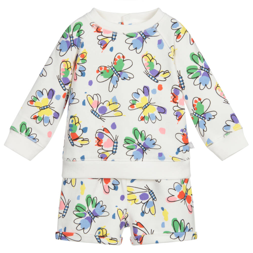 From Stella McCartney Kids, a white shorts and sweatshirt set with a colourful butterfly print. Soft and comfortable, both pieces are made in sustainable cotton sweatshirt jersey. The top has popper fasteners on the back and the shorts have a drawstring waistband.