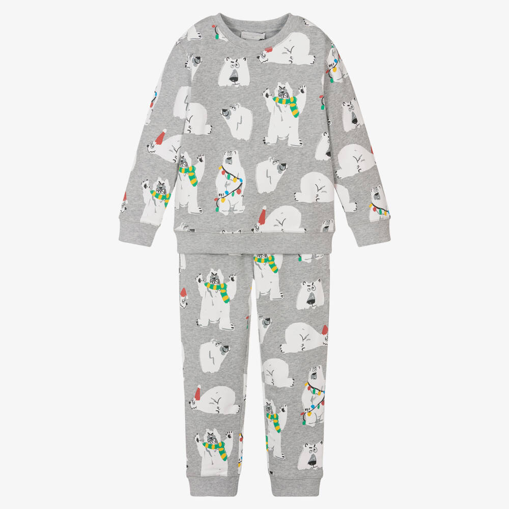 Grey marl tracksuit for boys and girls, by Stella McCartney Kids. Made in soft organic cotton jersey, this playful outfit is patterned with polar bears. Capturing joy and cheer, this cute Christmas co-ord has a fleecy inside and stretchy ribbed trims for comfort. The Stella McCartney fit can be quite small so choose a size up if you want room to grow.