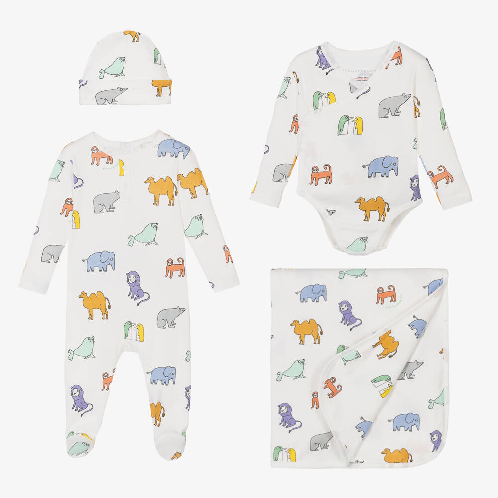 Presented in a lovely giftbox, this adorable ivory organic cotton gift set for baby boys and girls by Stella McCartney Kids includes a babygrow, bodyvest, blanket, and hat. Made from soft jersey that is gentle on delicate skin, all pieces are printed with a cute and colourful animal pattern. There are practical popper fastenings on the back of the babygrow, and on the front and between the legs of the bodyvest, for easy changing. The Stella McCartney fit can be quite small so choose a size up if you want room to grow.
