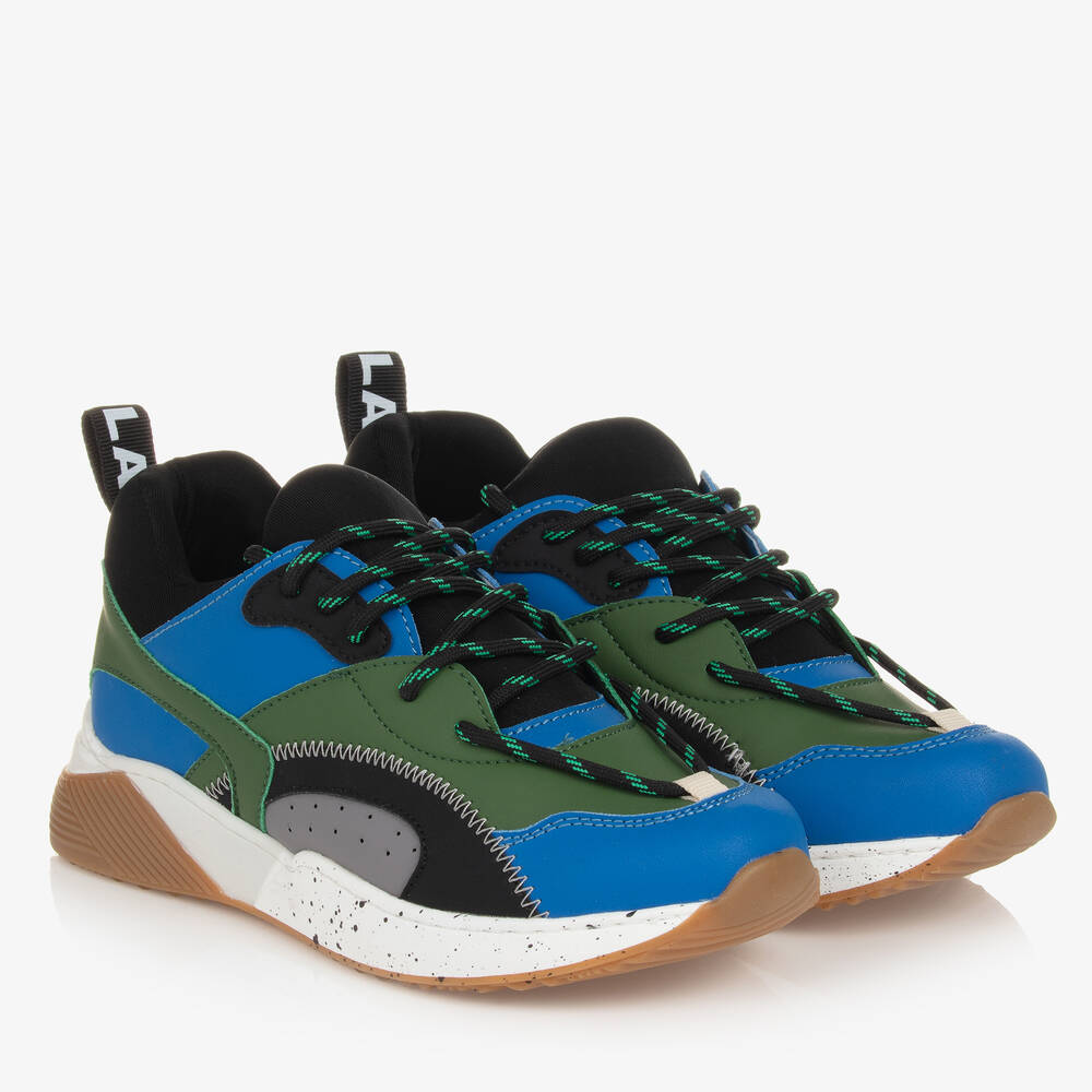 Blue faux leather trainers for teen boys by Stella McCartney Kids, with green, black and grey trims and a logo branded pull tab on the back of the heel. They have a softly padded textile insole and lining, rope-style laces and perforated side panels with zigzag stitched detailing. The white and brown non-slip rubber outer soles have a black paint splatter design on the sides for a cool finish.