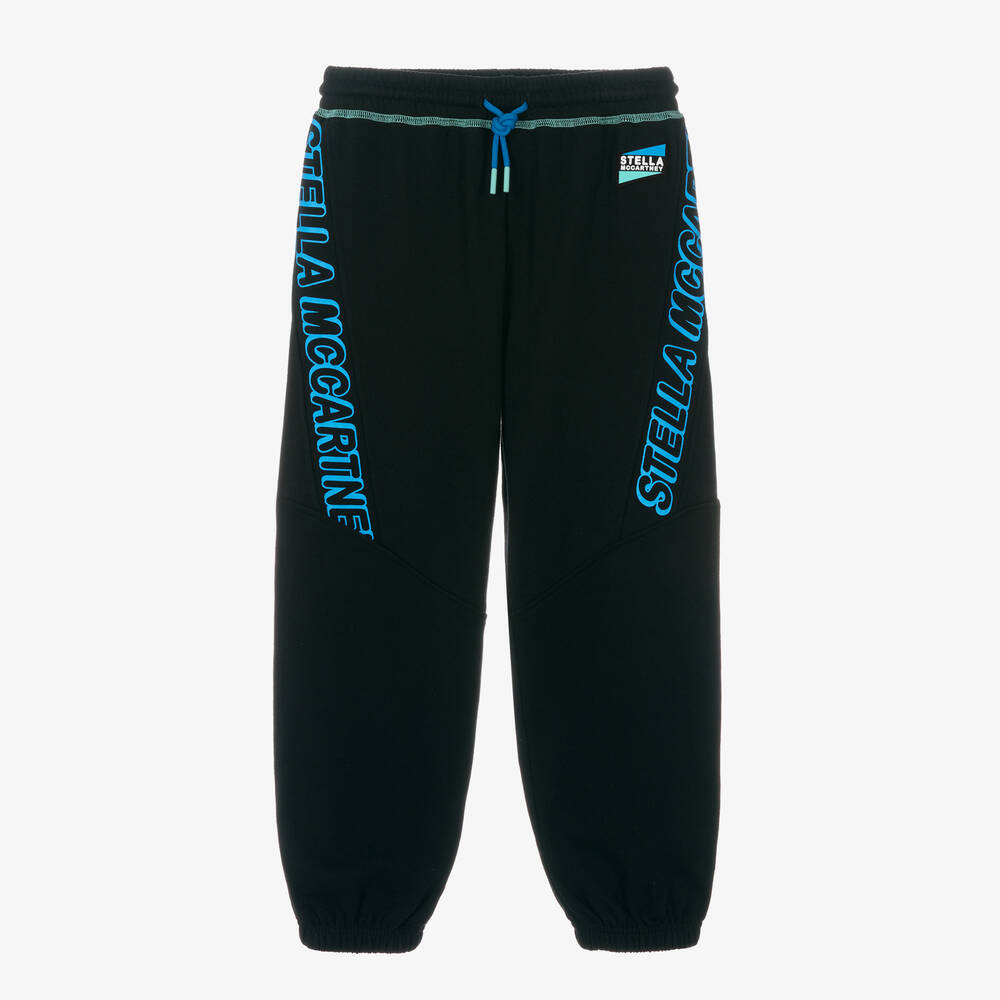 Black joggers for teen boys by Stella McCartney Kids, trimmed with bright blue logos down the sides. Great for casual sportswear, they are made in comfortable cotton jersey, with an elasticated drawstring waist. The ankle cuffs are elasticated for a snug fit and there is useful patch pocket on the back. A rubberised logo badge on the front adds an extra designer touch. The Stella McCartney fit can be quite small so choose a size up if you want room to grow.
