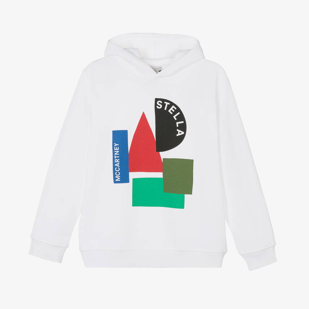 A casual white hooded sweatshirt for teen boys by Stella McCartney Kids, with large geometric shapes and logo printed on the front. Comfortable to wear, it has stretchy ribbed trims and is made in soft organic cotton jersey with a fleecy inside. The Stella McCartney fit can be quite small so choose a size up if you want room to grow.