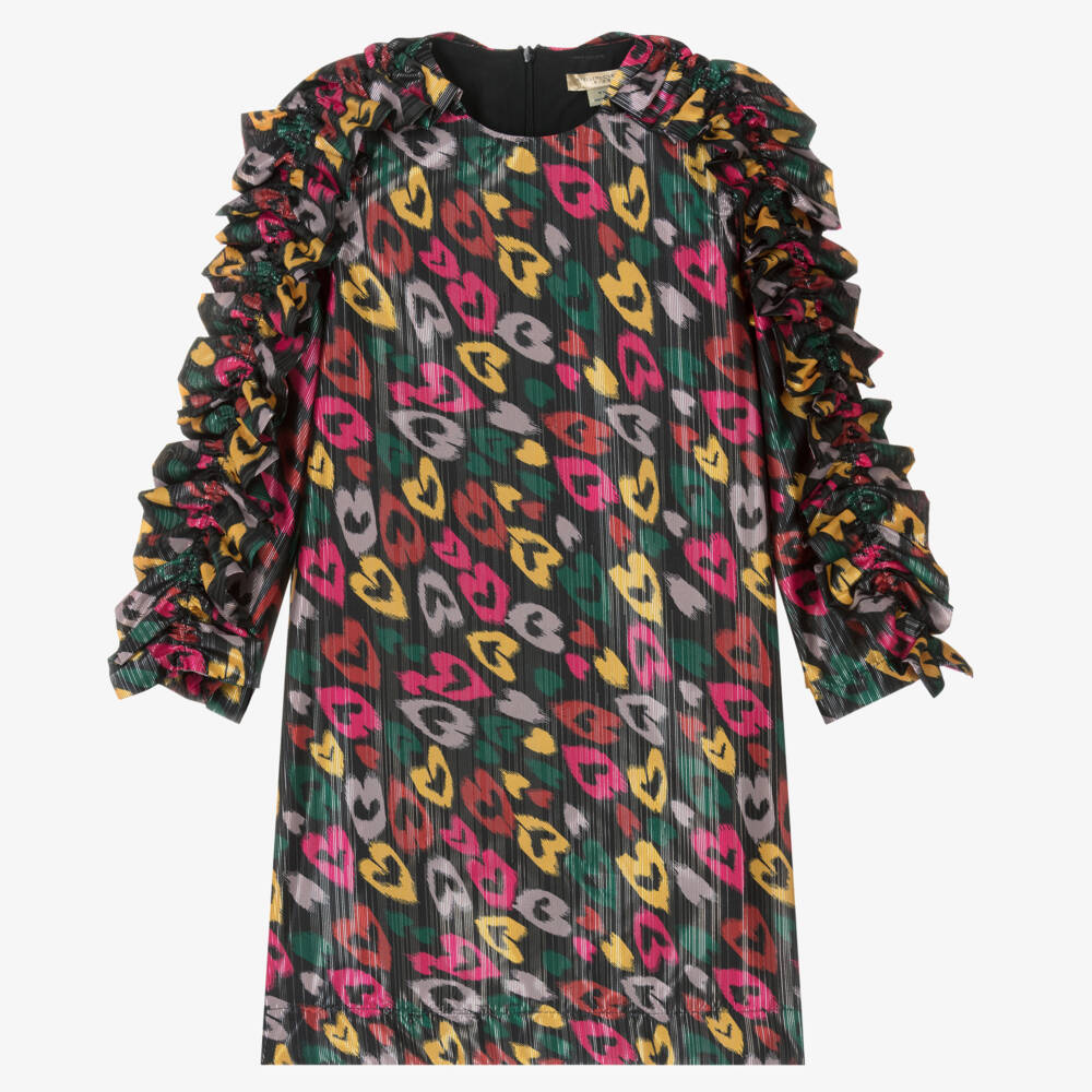 A glamorous black special occasion dress for teen girls by Stella McCartney Kids. The silky fabric is decorated in shiny metallic stripes with a multicoloured abstract heart design for a bold feminine look. It has stylish ruffle-trimmed sleeves and fastens neatly on the back with a concealed zip. This dress is made from sustainably recycled fibres and has a soft cotton voile lining. The Stella McCartney fit can be quite small so choose a size up if you want room to grow.