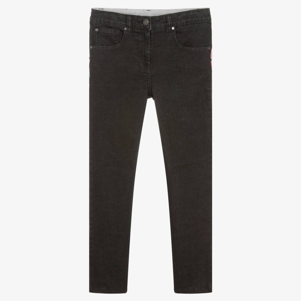 Bold and edgy, washed black skinny jeans for teen girls by Stella McCartney Kids. In a classic five-pocket styling, the outer seams are trimmed with striking logo taping in pink, green and black. Made in soft organic cotton denim with a slight stretch for comfort, they fasten with a zip and hook. The adjustable waistband has a logo tab at the back for an extra designer flair. The Stella McCartney fit can be quite small so choose a size up if you want room to grow.