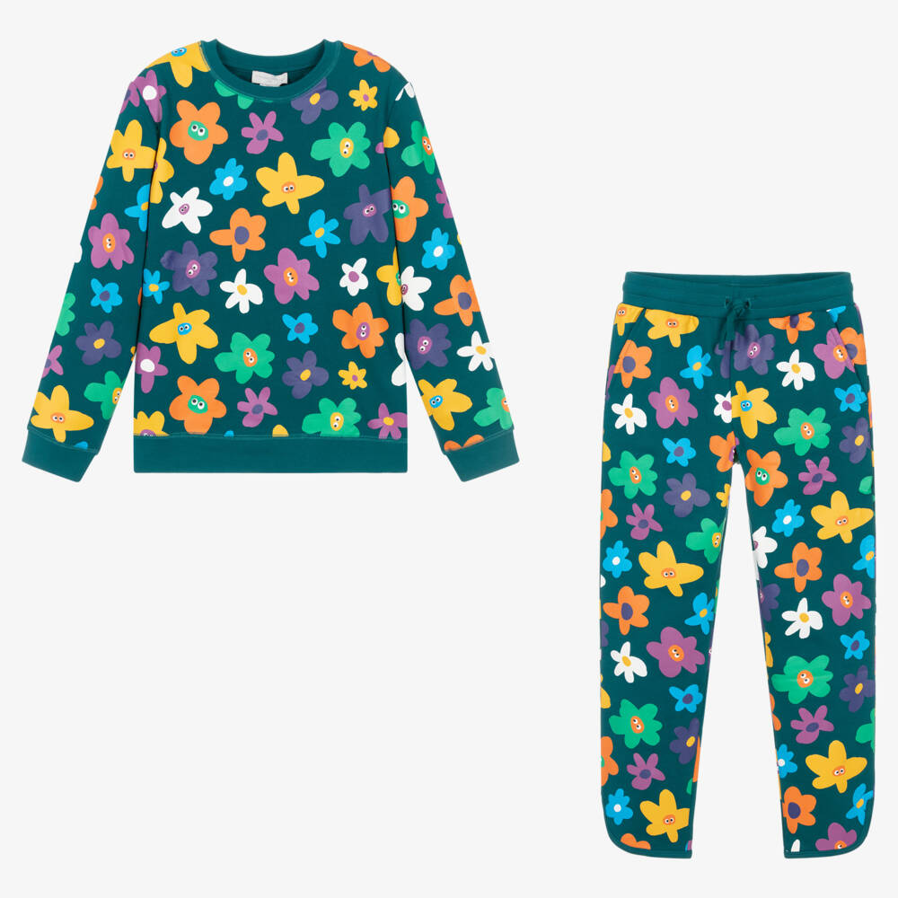 Teal blue cotton jersey tracksuit for teen girls by Stella McCartney Kids, in a colourful floral face graphic print. This quirky set is great for lounging, with shaped ankle cuffs and pockets on the joggers. A decorative tie on the elasticated waistband finishes the look. The Stella McCartney fit can be quite small so choose a size up if you want room to grow.