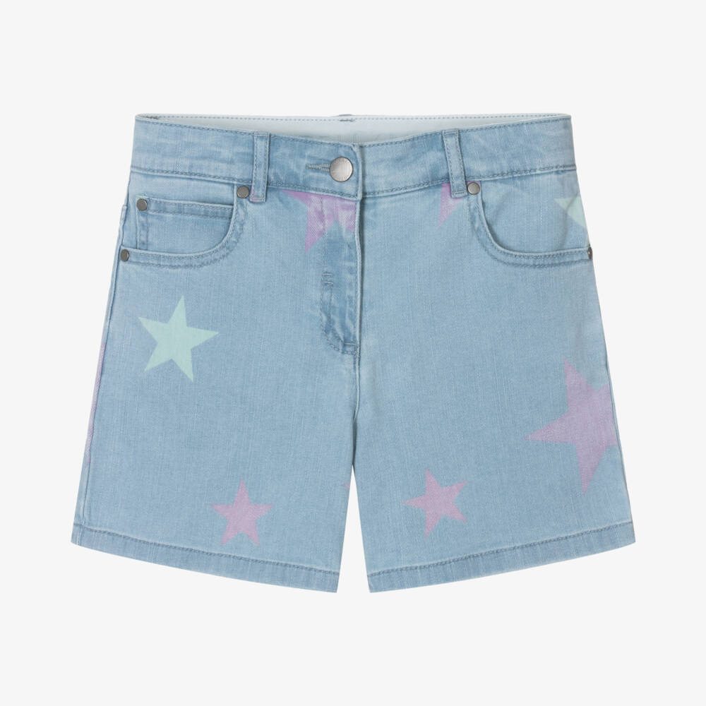 Blue organic cotton shorts for teen girls by Stella McCartney Kids, complete with a pink and mint green star print. Styled with five pockets, these casual shorts have branded hardware and a clip and zip fastening on the front. There is a logo tab on the back of the waistband and the soft denim fabric has a touch of stretch for easy, comfortable wear. The Stella McCartney fit can be quite small so choose a size up if you want room to grow.
