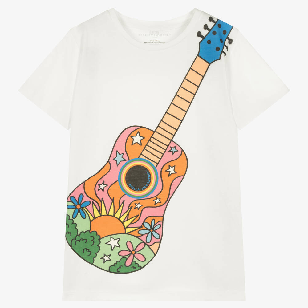 Ivory organic cotton T-shirt for teen girls by British label Stella McCartney Kids, made in soft and stretchy jersey. This quirky piece is designed with a retro '60s-style guitar and psychedelic flower graphic across the front, with a logo detail in the centre for a touch of designer appeal.