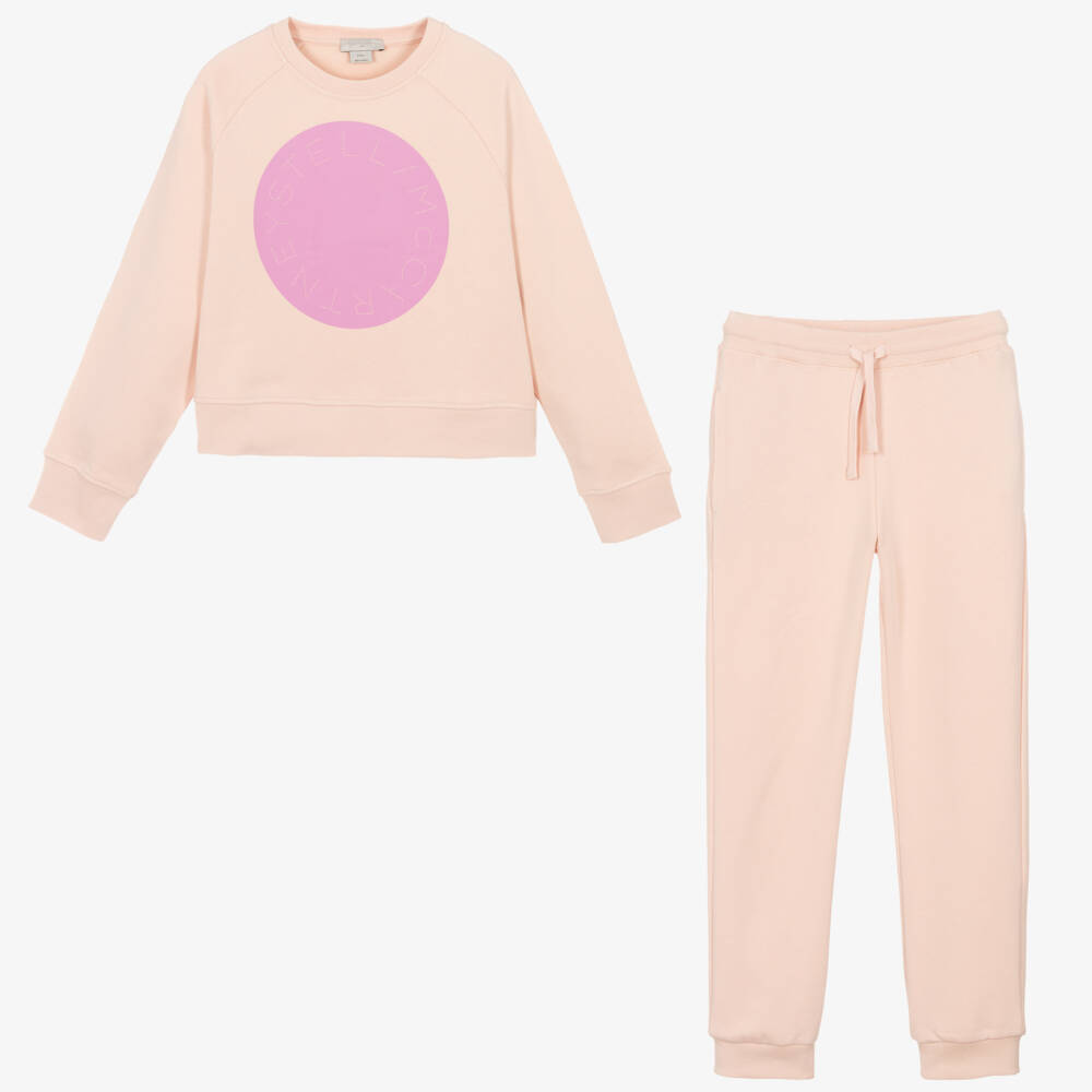 From British designer Stella McCartney Kids, a pale pink tracksuit for teen girls. The boxy sweatshirt has casual raglan sleeves, ribbed trims and a comfortable crew neck. The front has a circular logo print in contrasting pink, with the designer's name in micro dots for a signature look. The matching joggers have ribbed cuffs, side seam pockets and a smaller scale print on the back pocket. The drawstring waist can be adjusted for a great fit. Both pieces are made in mid-weight organic cotton jersey with a fleecy inside. The Stella McCartney fit can be quite small so choose a size up if you want room to grow.