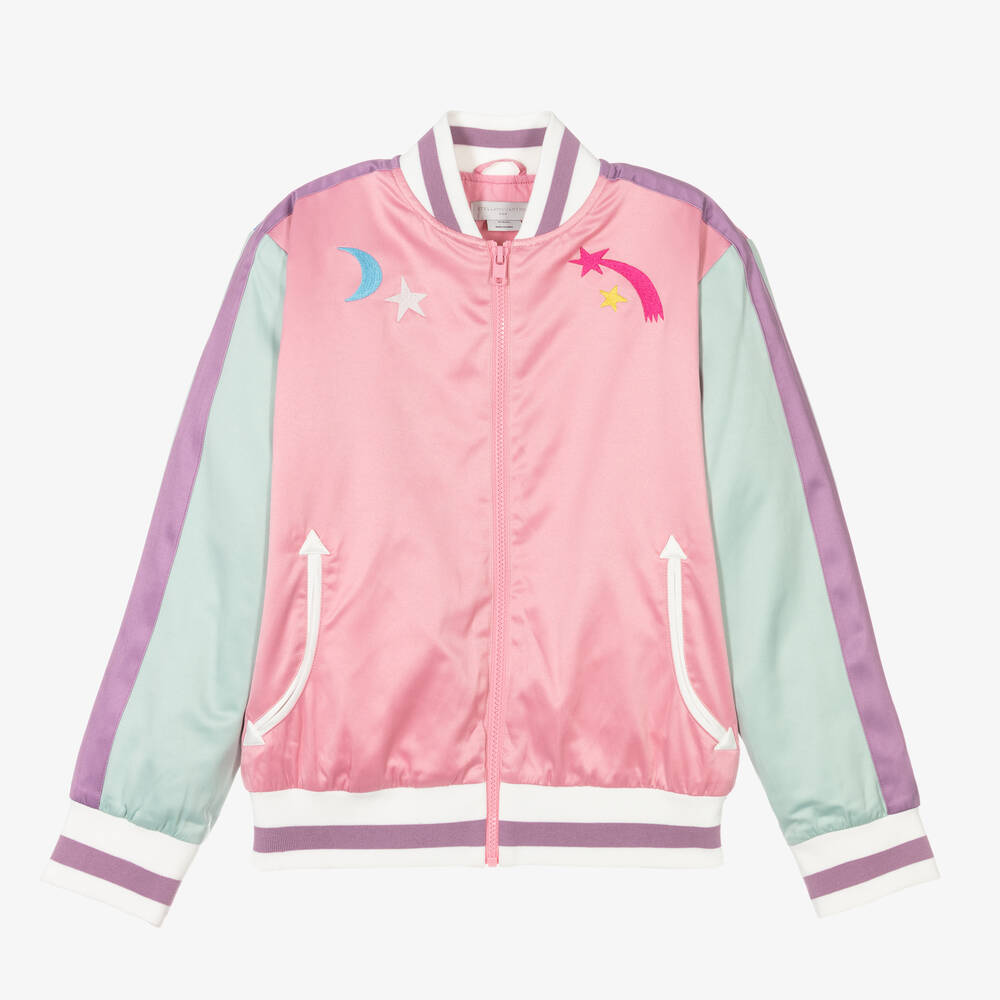 Colourblock bomber jacket for teen girls by Stella McCartney Kids, in pretty pastel colours. The striking sunset artwork embroidered on the back makes a bold statement, and the silky satin material gives this jacket a luxurious feel with a modern twist. The lilac striped ribbed trims have a sporty aesthetic, and the front is embroidered with pink, blue and yellow stars for a girly finish.